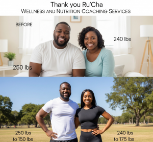 This inspiring weight loss transformation follows a couple who collectively shed pounds over six months, embarking on a journey that began when they decided to tackle their goals together. Their success stemmed from mutual motivation, shared healthy meal planning, joint workouts like morning walks and home exercises, and holding each other accountable, enhanced by their decision to join “Ru’Cha Wellness and Nutrition Coaching Services” to help them build a better relationship with food—proving that teamwork amplified their commitment and results. Sign up for a program that best suites your needs!