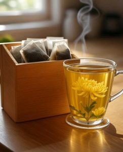 Chrysanthemum Flower Tea Enjoy Chrysanthemum Tea twice weekly for a soothing experience. Use 3-5 flowers per cup of water and steep for 2-3 minutes. Precautions: Consult a healthcare professional if pregnant or breastfeeding. Avoid if allergic to chrysanthemum pollen, ragweed, or if taking immune-suppressing drugs or blood pressure medication. The tea’s high potassium content may widen blood vessels and enhance blood flow.